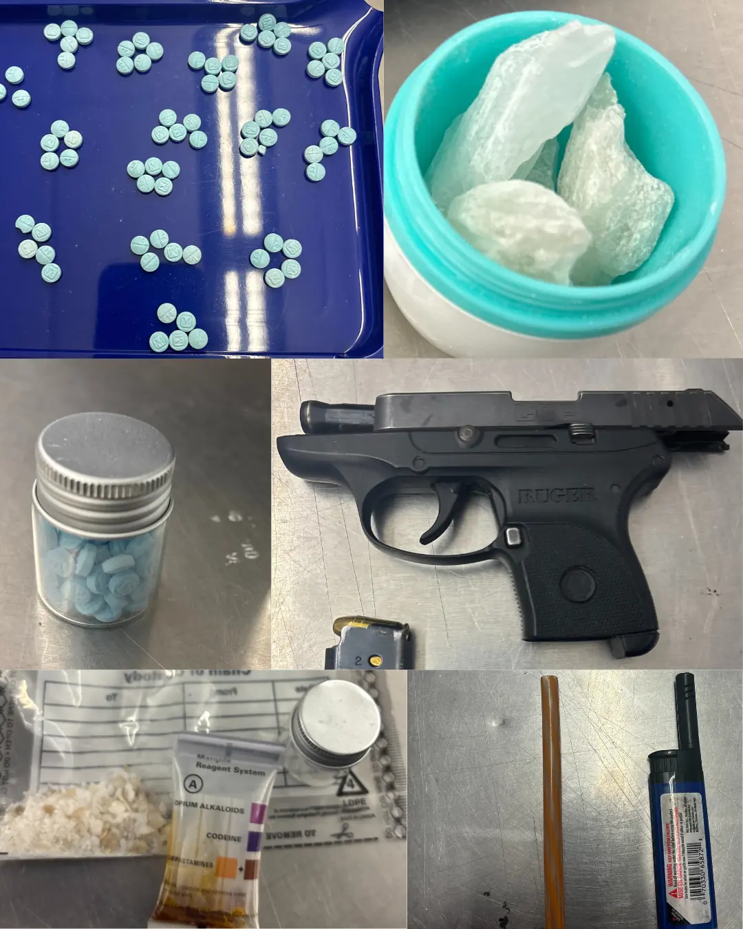 A photo collage of the evidence collected during the arrest including fentanyl pills and powder, a gun, methamphetamine, cocaine and drug paraphernalia.