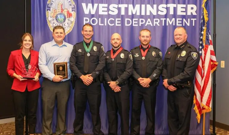Awardees and Chief Haubert at Awards Banquet. (pictured left to right: Samantha Spitz, Matthew Metzler, Senior Police Officer Evan King, Senior Police Officer Koltin Fatzinger, Senior Police Officer Tony Stroup, Chief Norm Haubert)