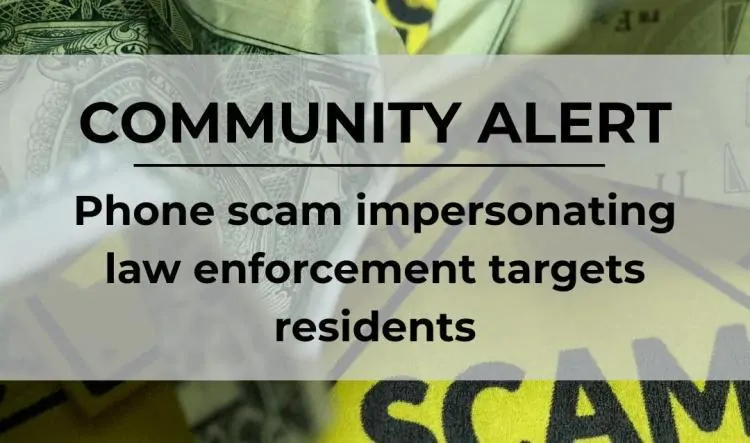Graphic that reads: Community alert, phone scam impersonating law enforcement targets residents.