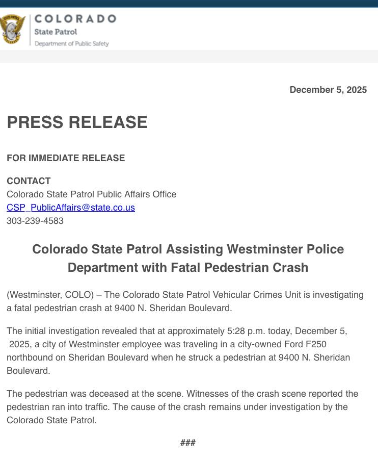 WESTMINSTER, Colo -- WPD responded out to a fatal auto-pedestrian crash near the 9400 block of Sheridan Blvd just before 5:30 p.m. on Friday, Dec. 5. Please see the below release from Colorado State Patrol as they will be handling the investigation.