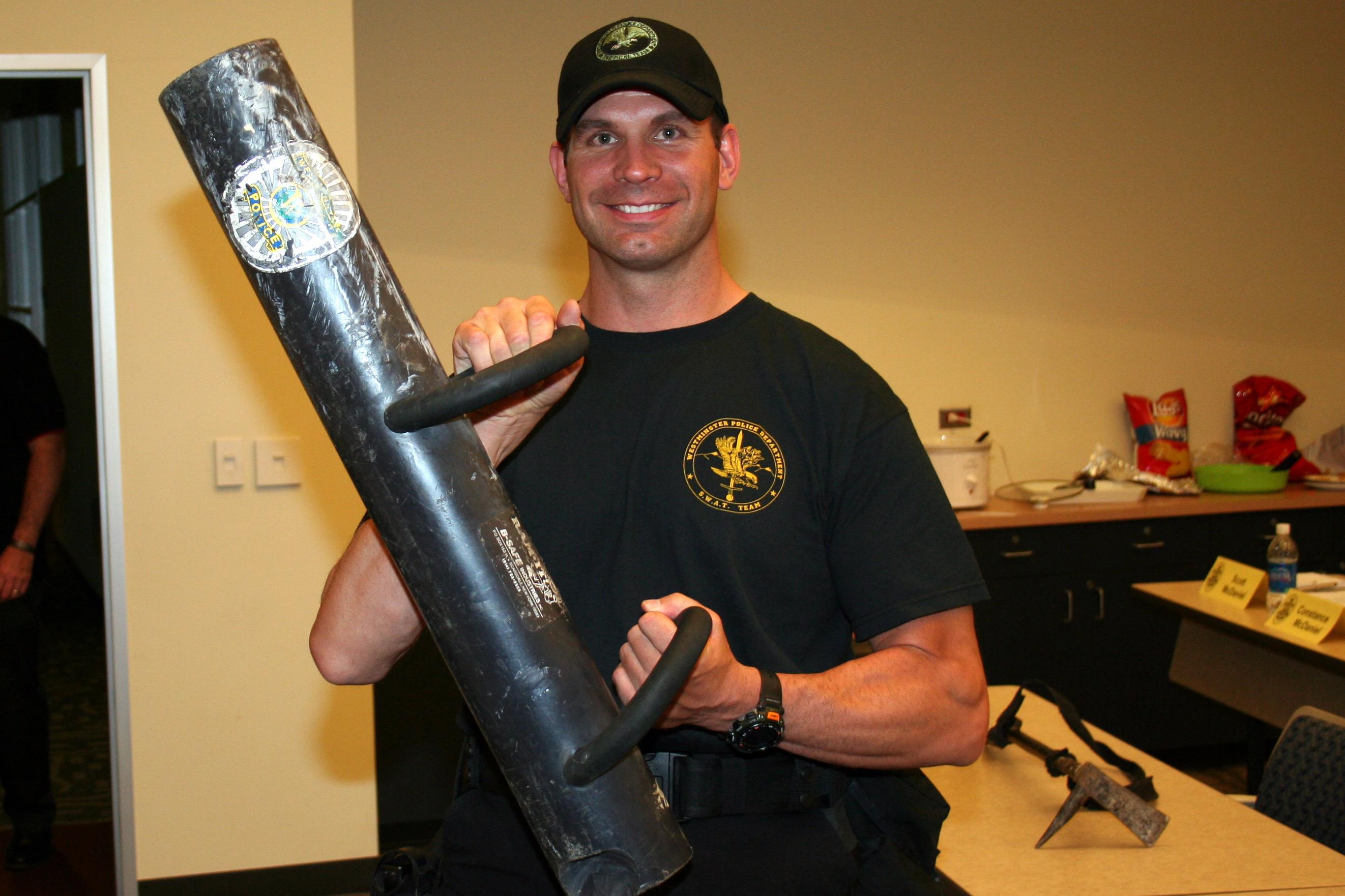 Sergeant Roll holding a battering ram.