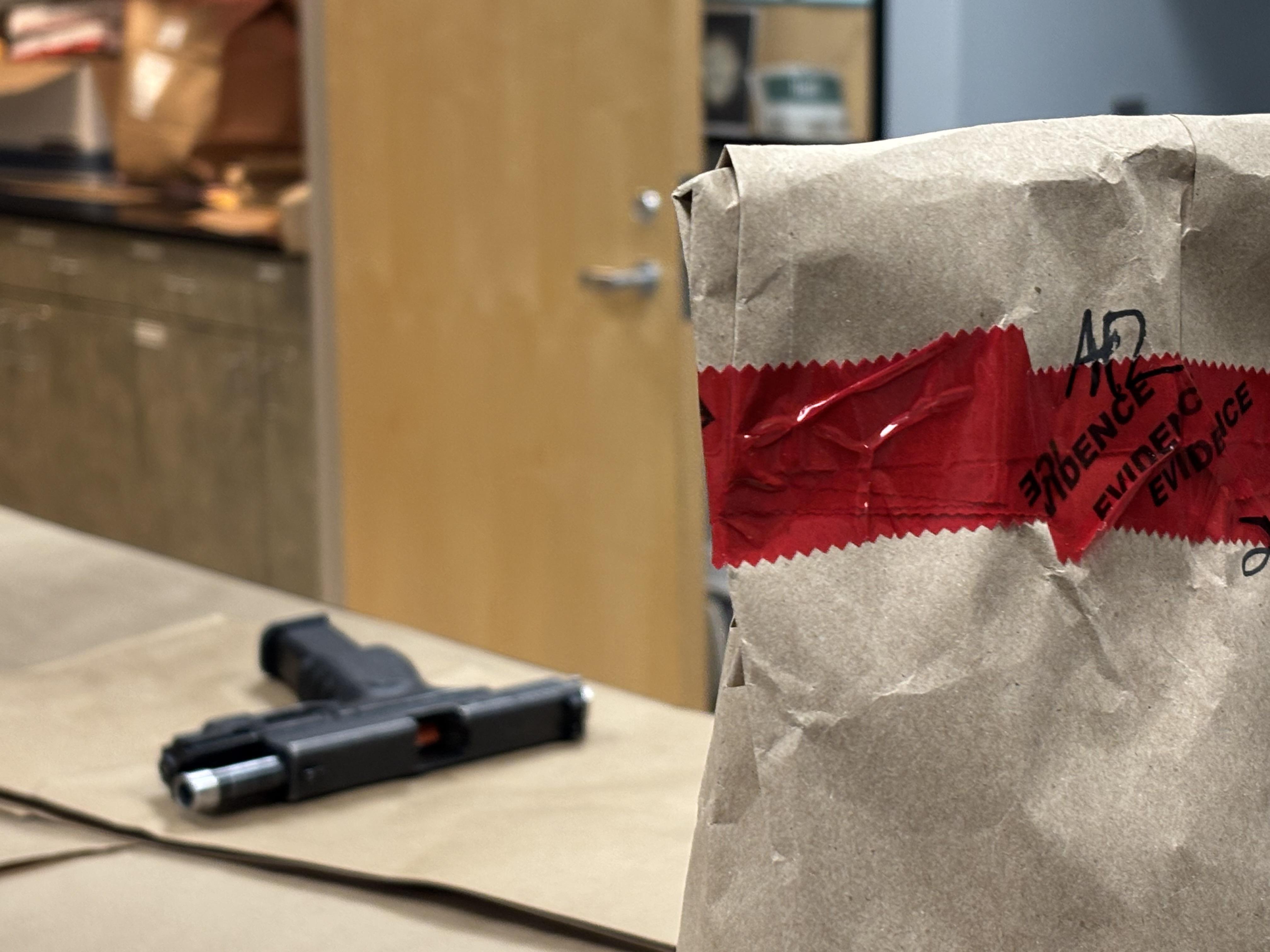 A gun and an evidence bag sitting on a table.